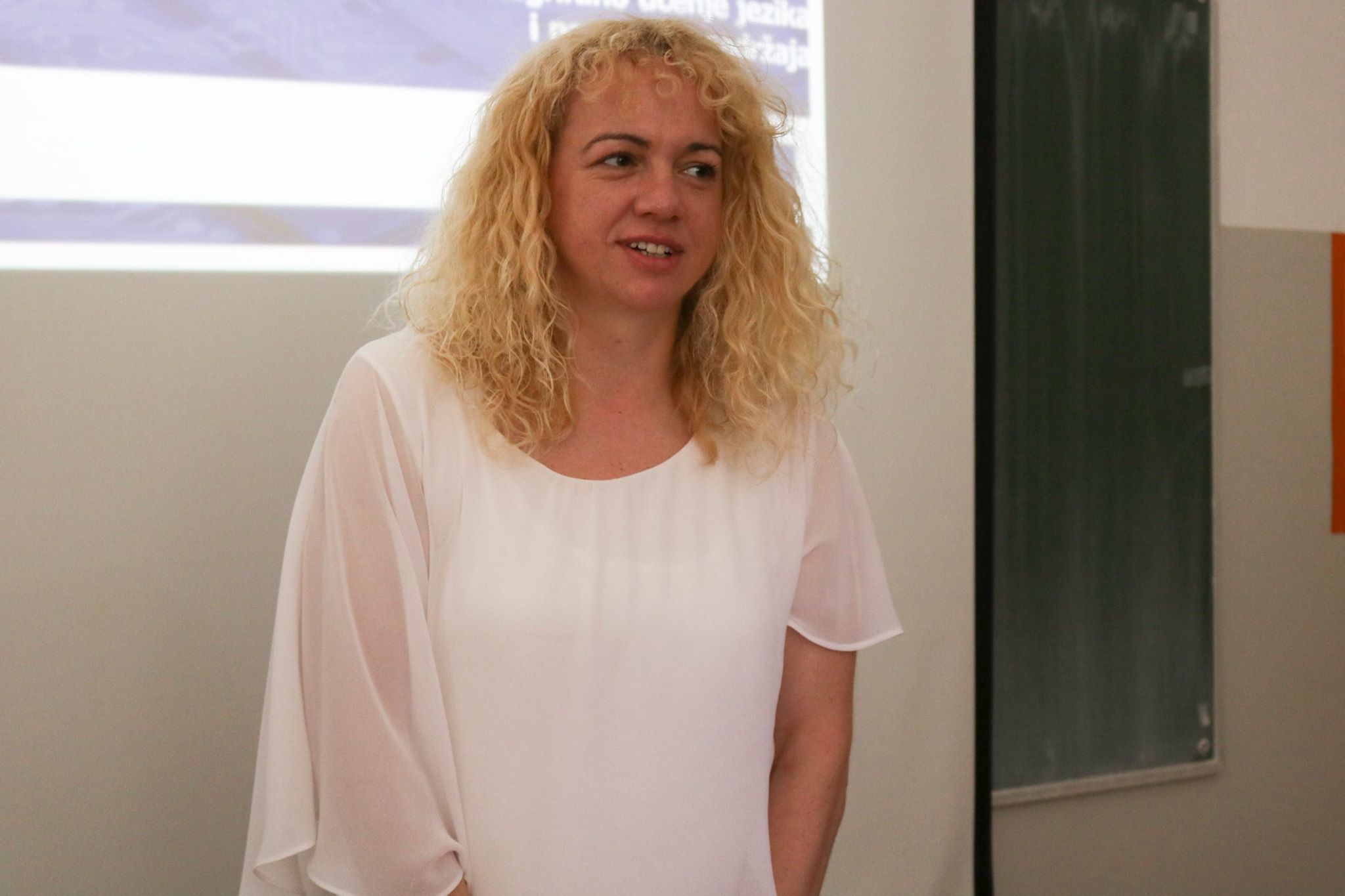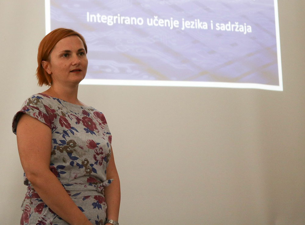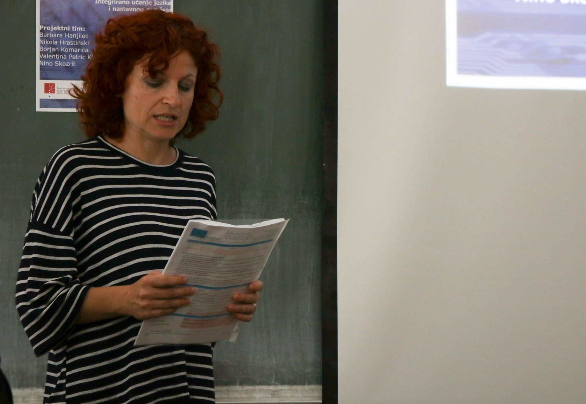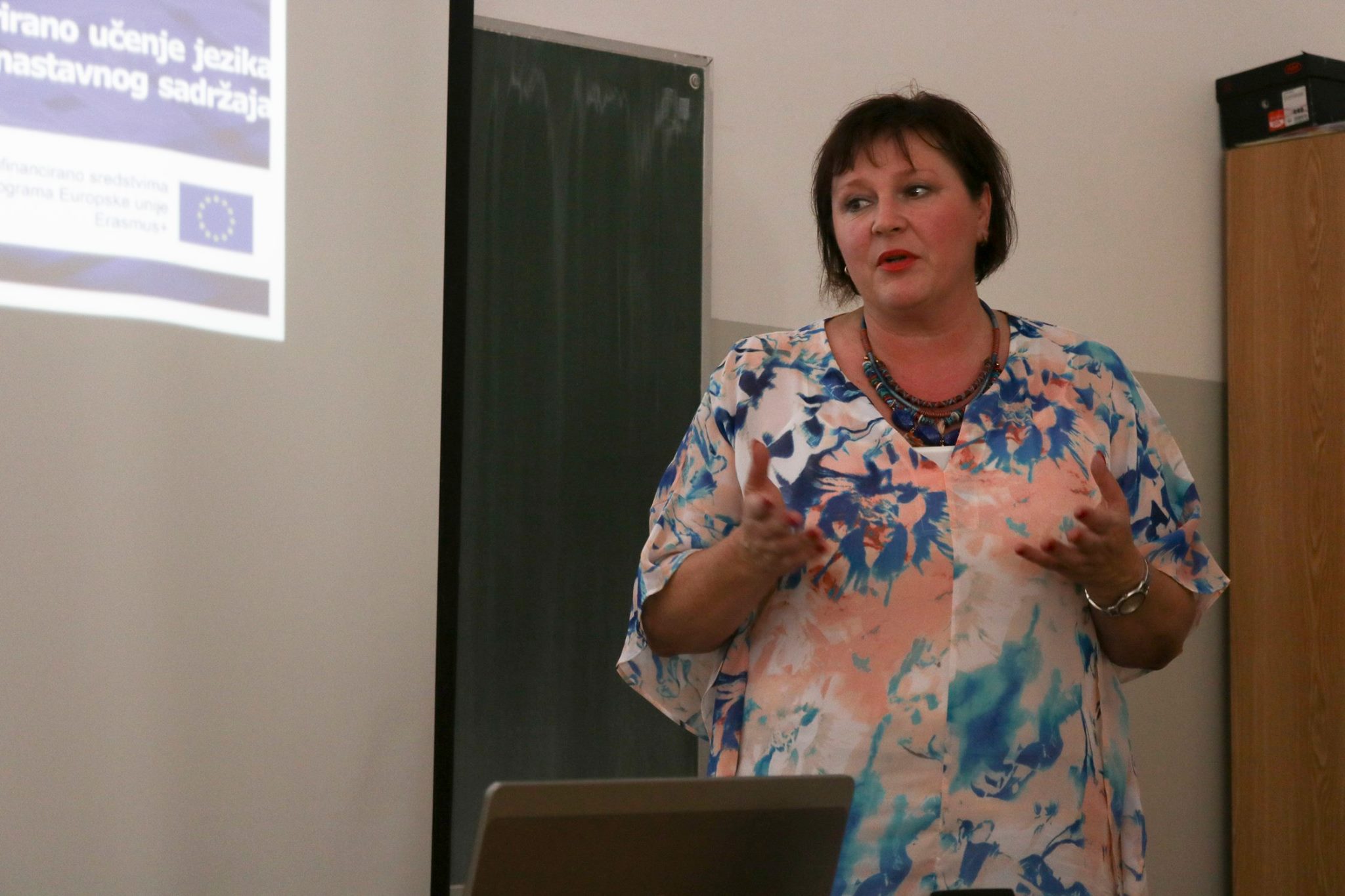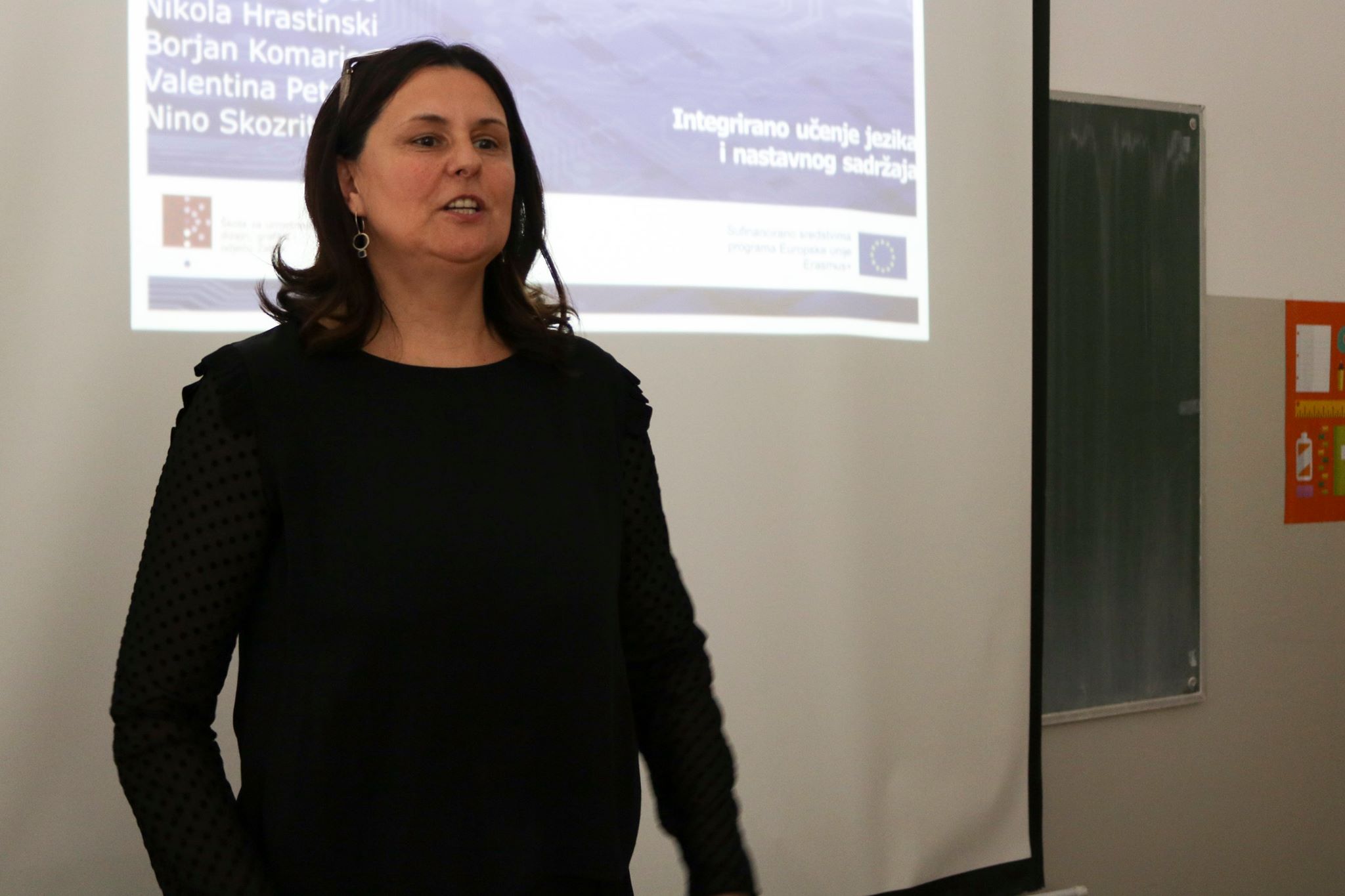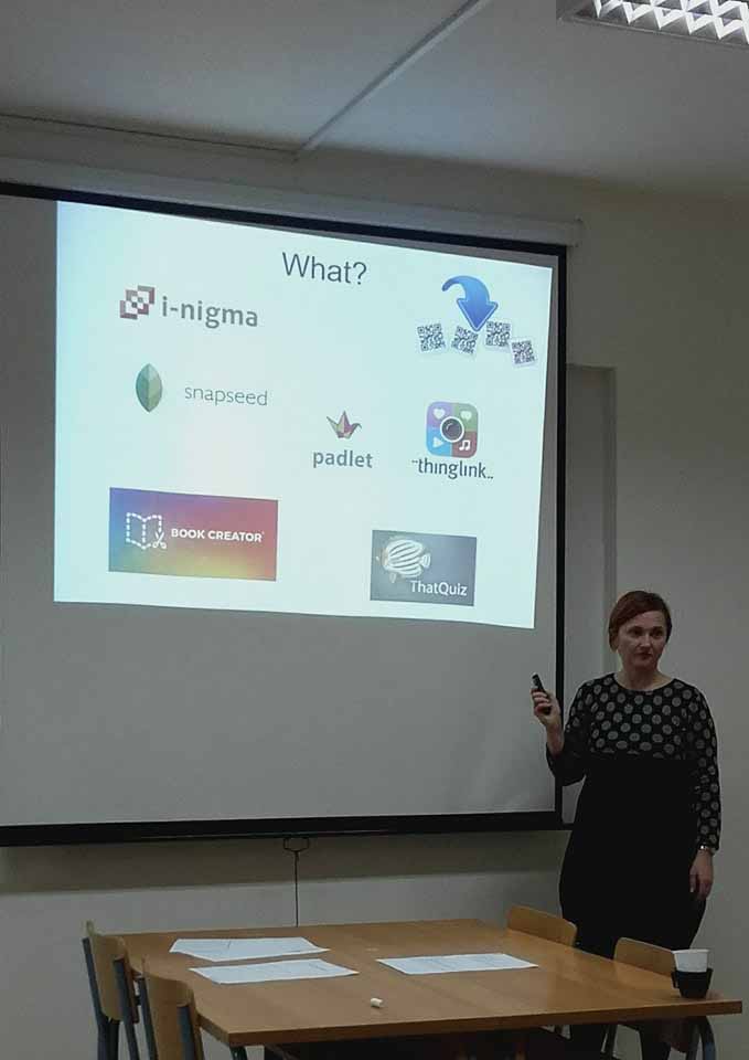 Okupljenim nastavnicima ukratko je predstavila Erasmus+ projekt Škole za umjetnost, dizajn, grafiku i odjeću Zabok: Primjena CLIL metode u sektoru web dizajna, odlazak na mobilnost u Cardiff te je pobrojala sve online alate i aplikacije s kojima se nastava engleskog jezika može ne samo obogatiti, nego i poboljšati, kao što su na primjer Thinglink, Padlet, Snapseed, Thatquiz, I-nigma, itd..,
