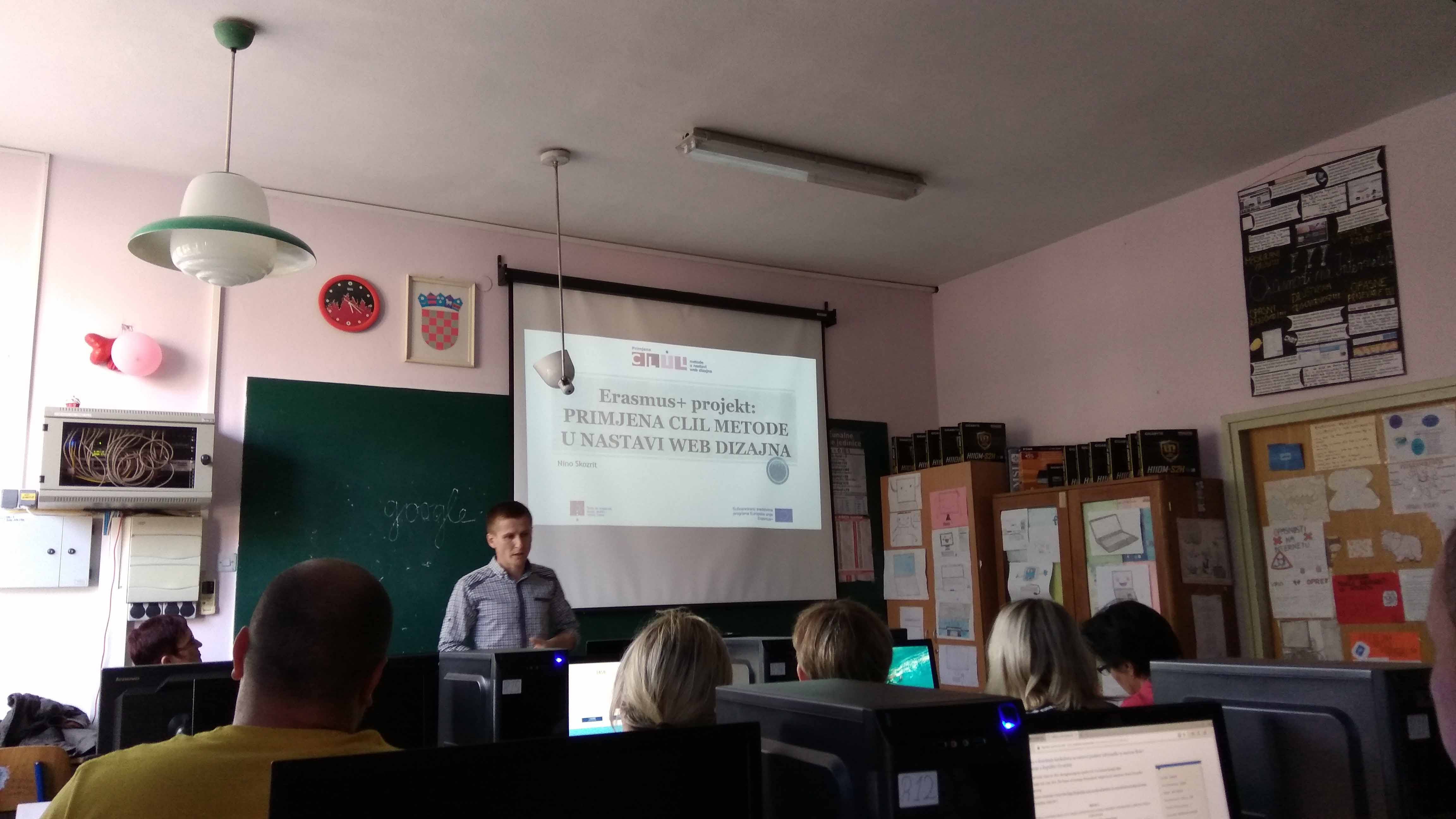 25.4.2018. nastavnik stručnih predmeta, mag. Nino Skozrit, održao je predavanje na temu „Erasmus+ projekt: Primjena CLIL metode u nastavi web dizajna“. Predavanje je održano na Županijskom stručnom vijeću za nastavnike i učitelje informatike u srednjim i osnovnim školama Krapinsko-zagorske županije u Zlataru.