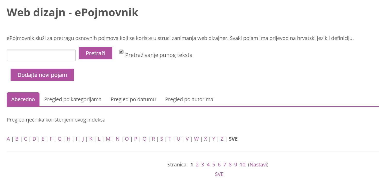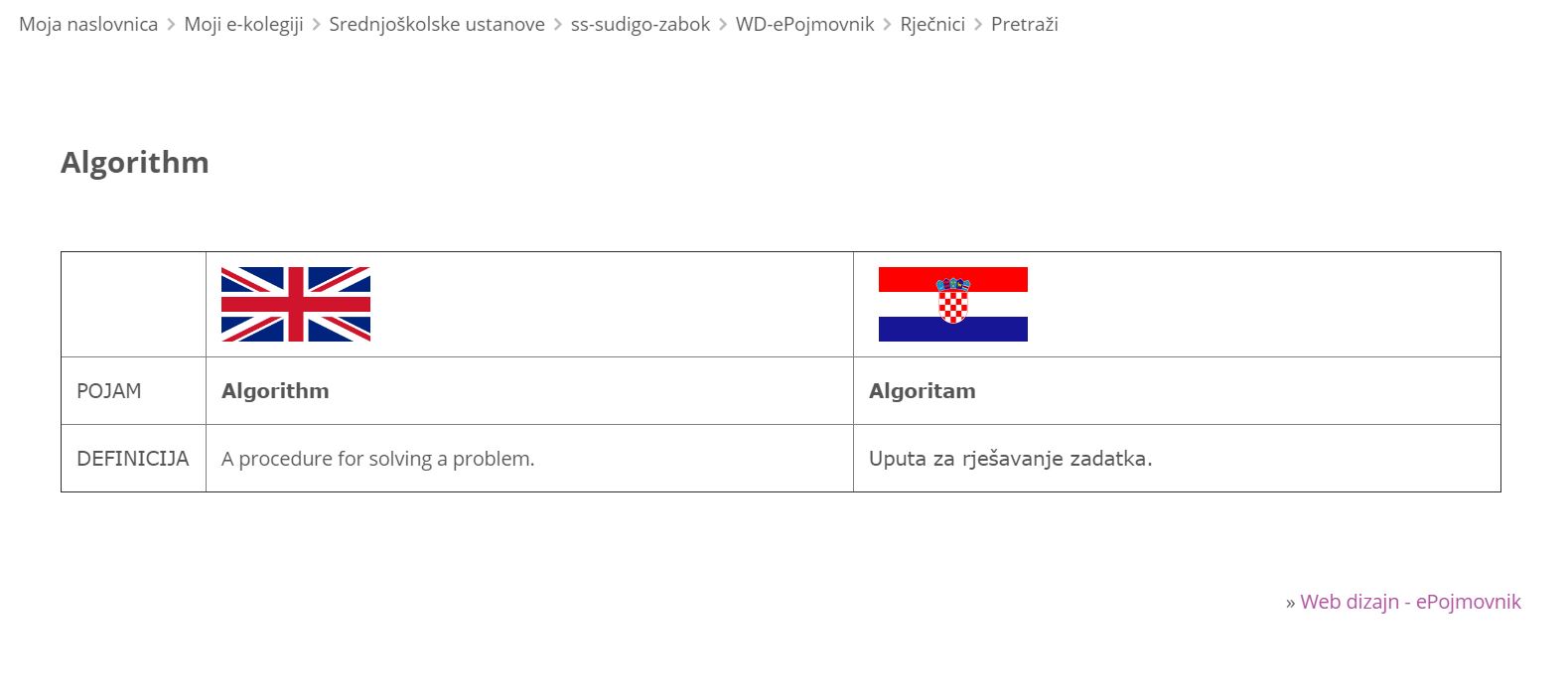 Kako bi učenicima omogućili što lakše snalaženje među stručnim pojmovima i njihovim mogućim različitim značenjima u različitim predmetima, izrađen je i dvojezični e – Pojmovnik stručne terminologije za područje nastavnih predmeta Likovna umjetnost, Dizajn za web i Programiranje za web. Nastavnici struke Borjan Komarica, Nikola Hrastinski i Nino Skozrit u suradnji s učenicima 2. web razreda izdvojili su 30-ak pojmova po pojedinom predmetu i objašnjavali ih na hrvatskom jeziku, a na satovima engleskog jezika s profesoricama Barbarom Hanjilec i Valentinom Petric Klaužer iste su pojmove prevodili i objašnjavali na engleskom jeziku te ih unosili u e – Pojmovnik. E – Pojmovnik je dostupan na web stranici projekta i može mu pristupiti svaki učenik i profesor sa AAI računom.