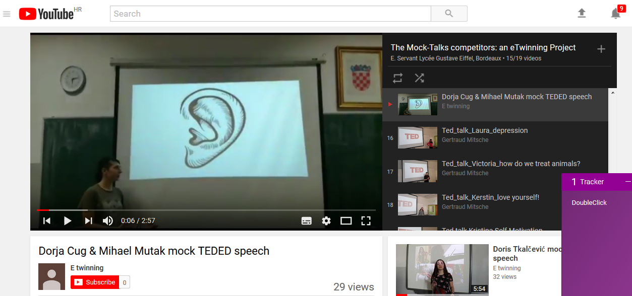 Na razini Europe prof. Barbara Hanjilec uključila se u projektSpeech Competition: Mock TedEd Talk u kojem su učenici 6 zemalja snimili govore na engleskom jeziku o temi po izboru u trajanju od 3 do 5 minuta. Govori su postaljeni na You Tube kanal i potom su učenici preko Google obrasca glasovali za najbolje govore u par kategorija. Našu su školu predstavljali učenici 2.MT razreda: Doris Tkalčević, Dorja Cug i Mihael Mutak koji su se vršnjacima iz Europe predstavili govorima o muzici.