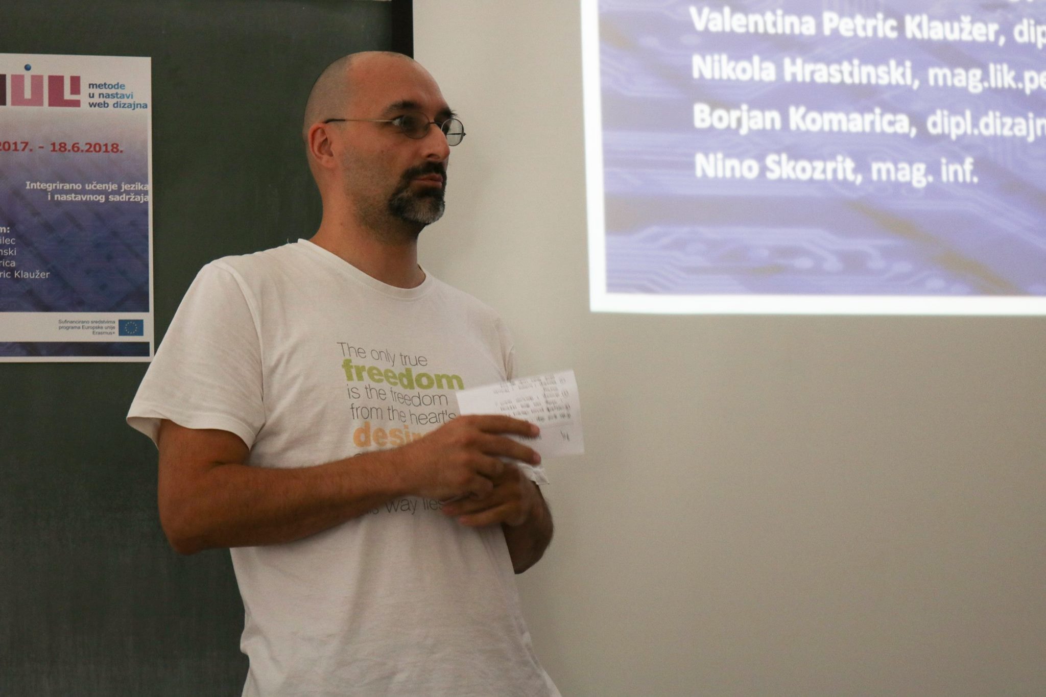9.1.2018. nastavnik stručnih predmeta, mag. Nino Skozrit, održao je predavanje na temu „Web alati u CLIL nastavi“ u Školi za umjetnost, dizajn, grafiku i odjeću Zabok u okviru stručnog aktiva. Predavanje su slušali nastavnici stručnih predmeta zanimanja web dizajner.