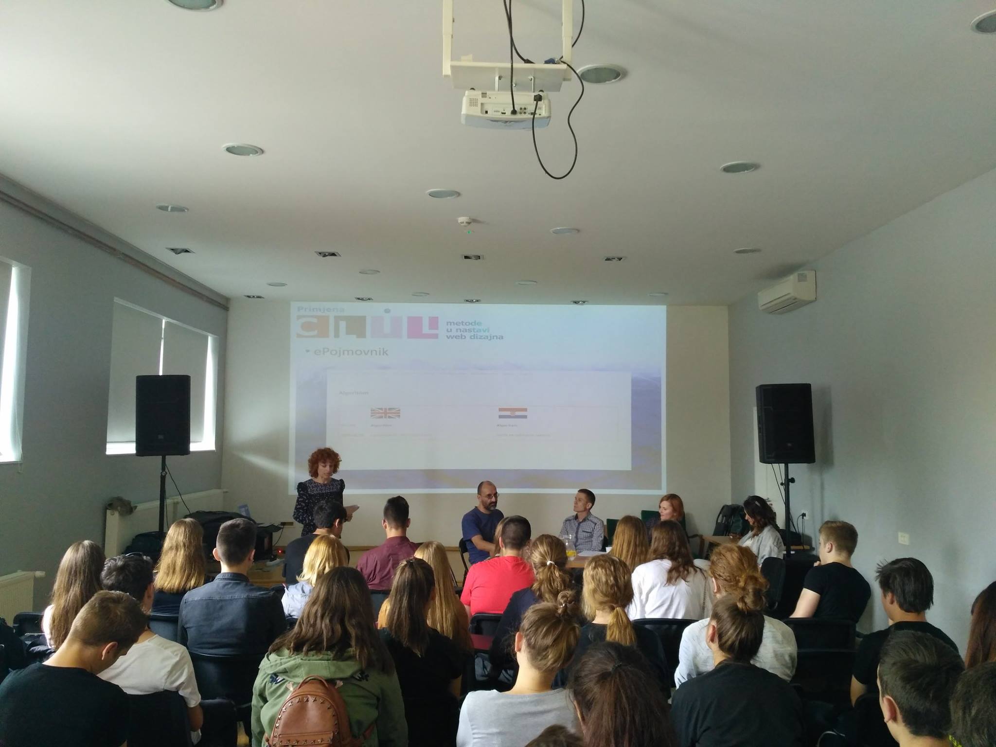 U panel diskusiji sudjelovali su profesori, članovi projektnog konzorcija – Barbara Hanjilec, Borjan Komarica, Nikola Hrastinski i Nino Skozrit. Moderatorica Valentina Petric Klaužer istaknula je kako se projekt Primjena Clil metode u nastavi web dizajna, odnosno integrirano učenje jezika i sadržaja provodi od 19.lipnja ove godine i završava 18. lipnja sljedeće godine, a glavne faze projekta su mobilnost nastavnika, izrada e-pojmovnika, pilot dvojezična nastava u 2. WEB razredu u tri predmeta struke i naravno održivost projekta. Profesorica Hanjilec objasnila je učenicima na koji će se način provoditi dvojezična pilot nastava te istaknula važnost zastupljenosti stručnih sadržaja u nastavi engleskog jezika. O važnosti engleskog jezika u predmetu Dizajn za web govorio je profesor Komarica te istaknuo na koji način planira primijeniti ono što je naučio na mobilnosti u Engleskoj. Profesor Skozrit se na edukaciji na Malti upoznao s praktičnom primjenom on line alata u Clil nastavi pa je učenicima objasnio na koji način će to primijeniti. Kako bismo uspješno provodili dvojezičnu nastavu, ali i pomogli u daljnjem svladavanju gradiva planirana je i izrada e-pojmovnika. Profesor Hrastinski pojasnio je učenicima koja je njihova uloga u izradi e-pojmovnika i na koji će se način spomenuti pojmovnik izrađivati.